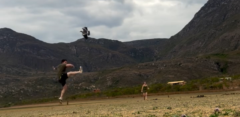O pássaro surgiu de repente e iniciou uma investida contra o casal. Os dois abandonaram a pose romântica e entraram em fuga. A cena registra os gritos e risos do casal enquanto tentavam escapar do animal destemido.