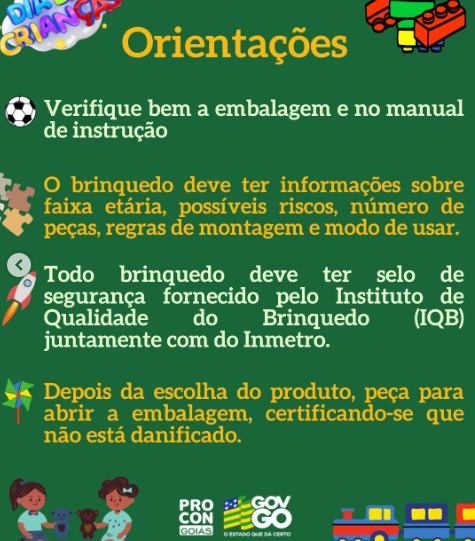 O Procon Goiás alerta que pesquisar é a melhor forma de economizar, principalmente em datas comemorativas, quando os preços costumam ter grande variação. O órgão ainda orienta os consumidores a verificar se os brinquedos possuem selo de segurança do Inmetro e do Instituto de Qualidade do Brinquedo (IQB).
