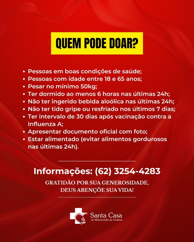 As doações são recebidas no Banco de Sangue da Santa Casa de Misericórdia de Goiânia, que fica na Rua Campinas, Vila Americano do Brasil, em Goiânia. A Santa Casa reforça o pedido à comunidade para colaborar o quanto antes e garantir atendimento seguro para os pacientes que precisam de transfusões. Para mais informações, o contato é (62) 3254-4200.