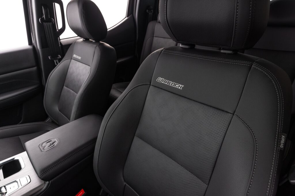 Internamente, a Ram Dakota Warlock exibe a tecnologia e luxo característicos de uma Ram, com destaque para o interior exclusivo composto por materiais nobres e macios ao toque que revestem os painéis de instrumentos e de porta, além dos bancos dianteiros elétricos. Duas telas dispostas lado a lado funcionam como quadro de instrumentos e central multimídia sendo esta segunda de 12,3” com Android Auto e Apple CarPlay sem fio e navegação embarcada.
