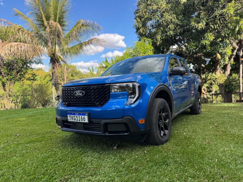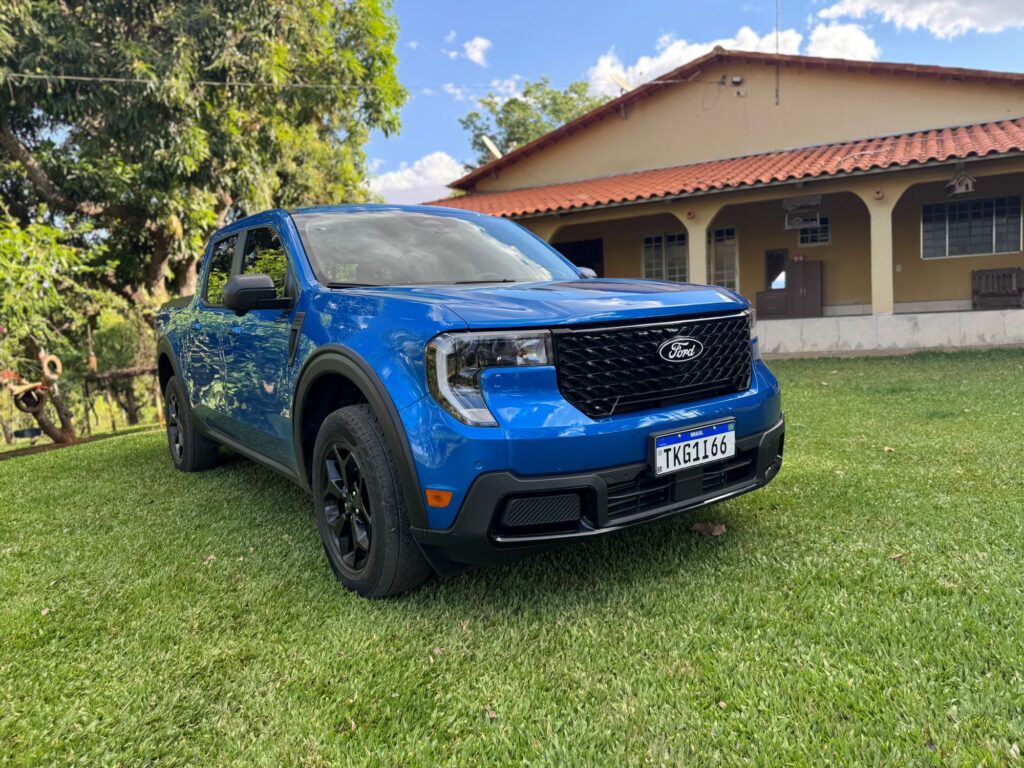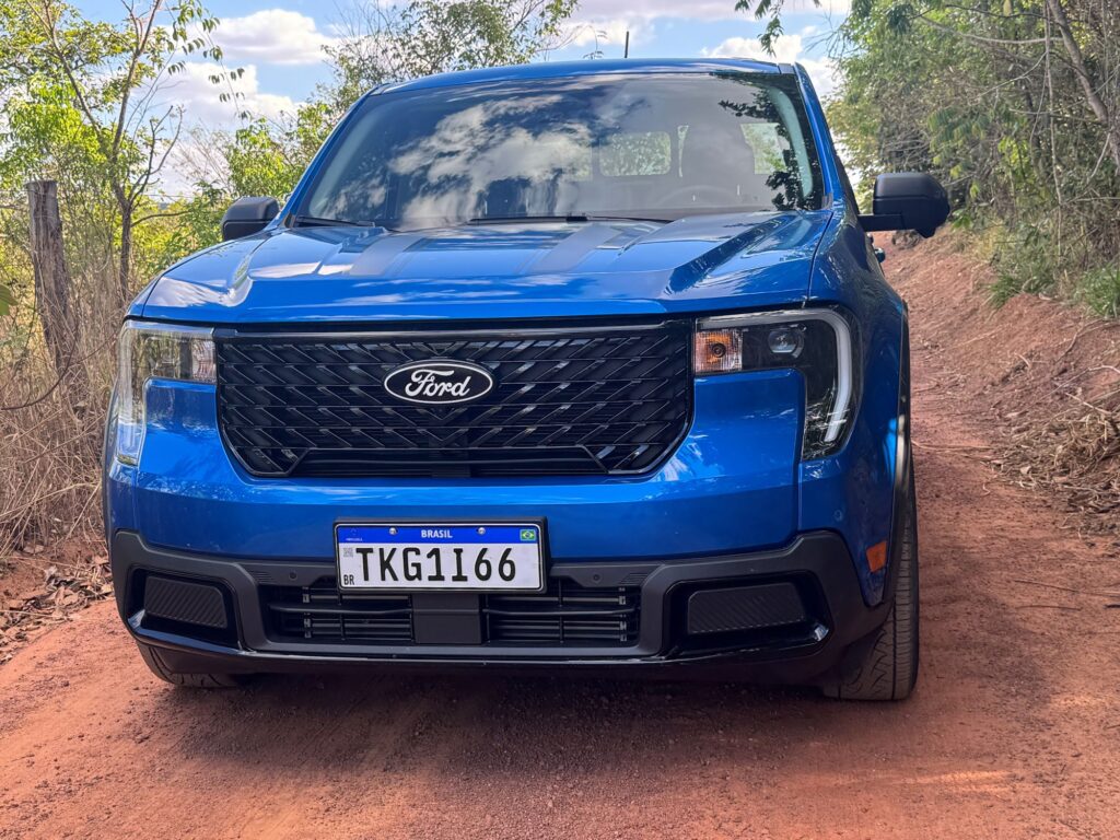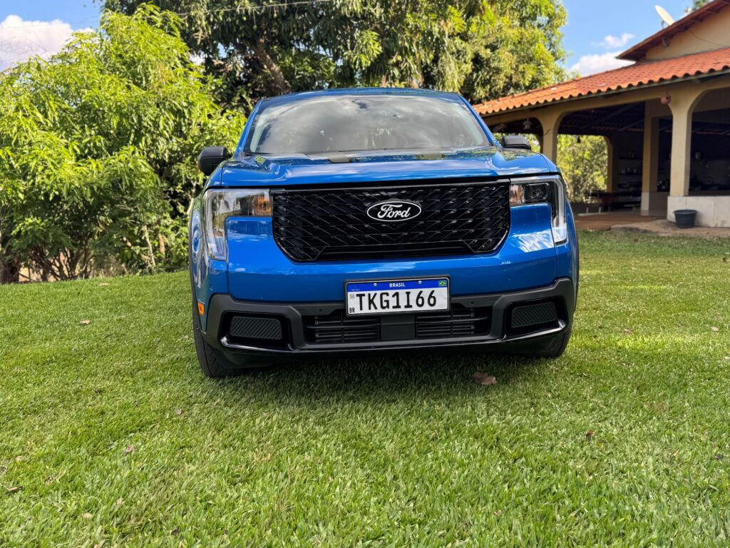 A linha 2026 da versão avaliada Lariat Black ganha novos faróis, agora menores e em forma de vírgula, com DRLs. A grade frontal também é nova. Ela não traz mais a barra horizontal central, cujo detalhe agora é exclusividade da versão Tremor. Em compensação ganha traços diagonais em preto brilhante. Bem trabalhada, a nova grade deu um toque de modernidade à picape. Para cada versão da Maverick, a grade apresenta um padrão próprio.