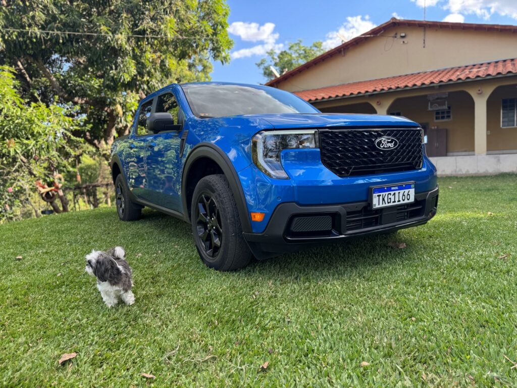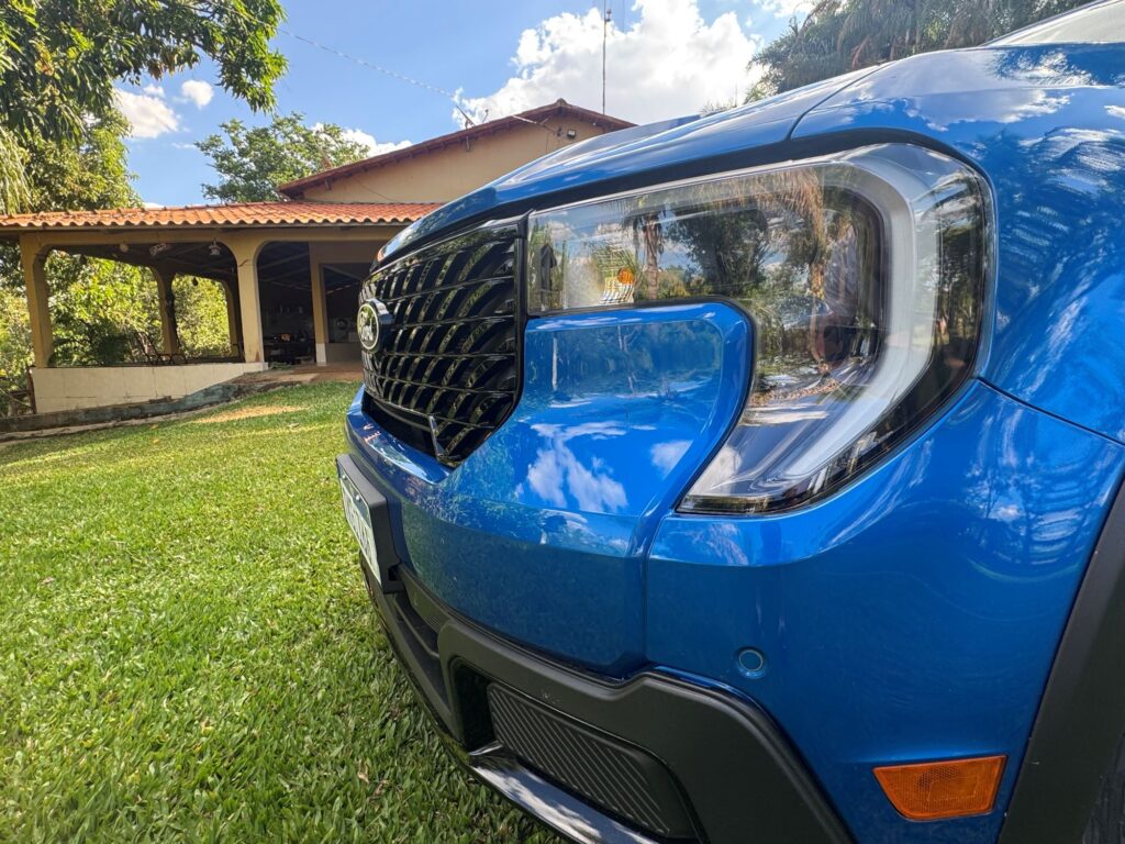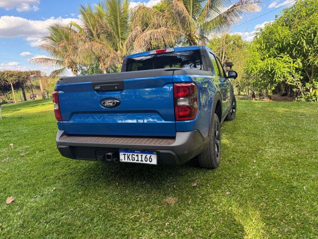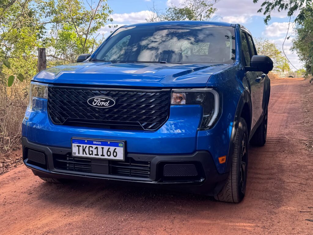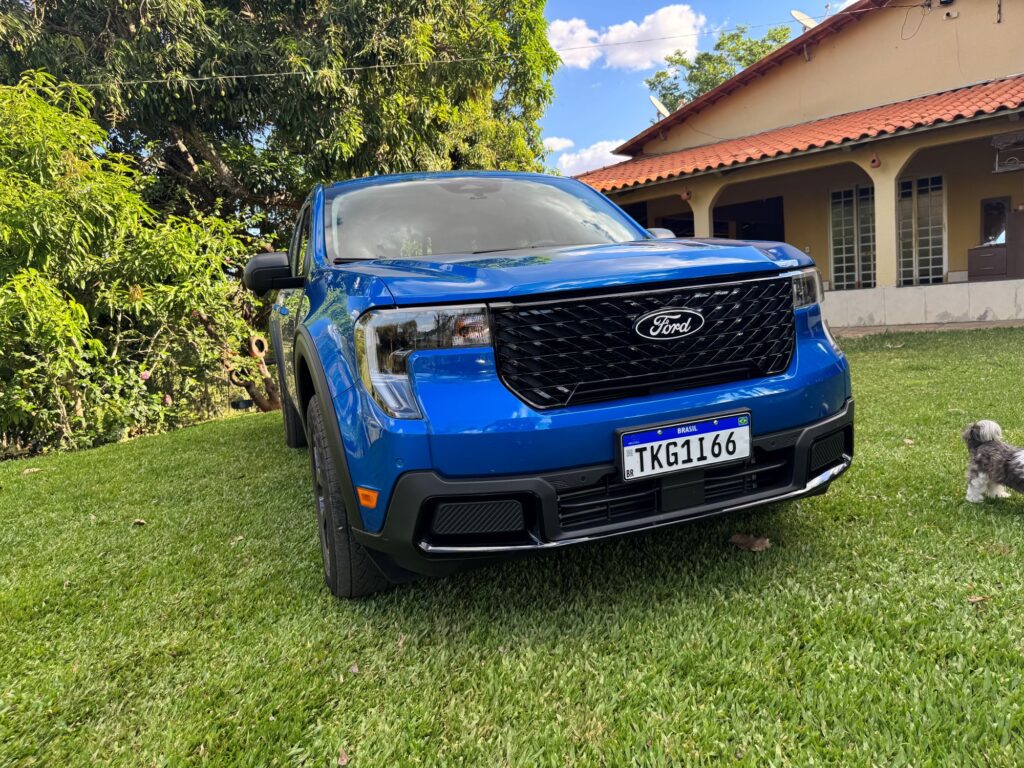 A linha 2026 da versão avaliada Lariat Black ganha novos faróis, agora menores e em forma de vírgula, com DRLs. A grade frontal também é nova. Ela não traz mais a barra horizontal central, cujo detalhe agora é exclusividade da versão Tremor. Em compensação ganha traços diagonais em preto brilhante. Bem trabalhada, a nova grade deu um toque de modernidade à picape. Para cada versão da Maverick, a grade apresenta um padrão próprio.